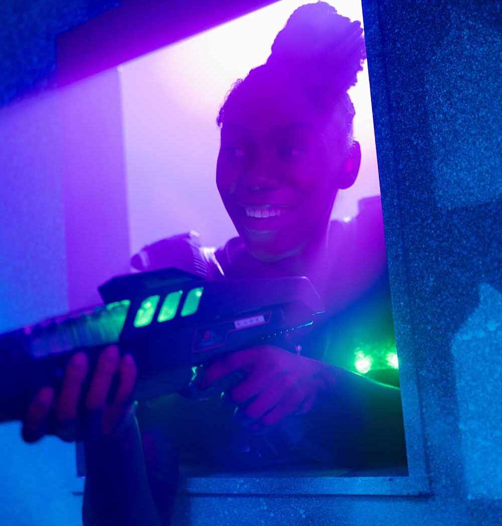We recommend wearing comfortable, dark-colored clothing and closed-toe shoes. Dark clothing helps you blend into the arena’s lighting, giving you a competitive edge, while sneakers ensure you can move around easily.